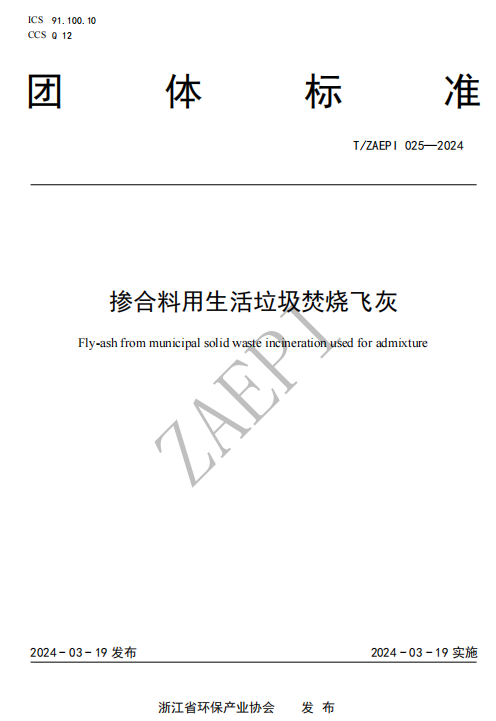 《摻合料用生活垃圾焚燒飛灰》標準號T/ZAEPI 025-2024,該標準由浙江京蘭環(huán)保科技有限公司和浙江大學主編,由浙江省環(huán)保產業(yè)協會于2024年3月19日批準發(fā)布,2024年3月19日起實施。文件規(guī)定了摻合料用生活垃圾焚燒飛灰的術語和定義、技術要求、試驗方法、檢驗規(guī)則、包裝、標志、運輸和貯存。文件適用于低溫熱分解及水洗解毒工藝處理后符合 HJ 1134規(guī)定的摻合料用生活垃圾焚燒飛灰,為后續(xù)飛灰處理產物的產品化進一步拓寬了應用場景。